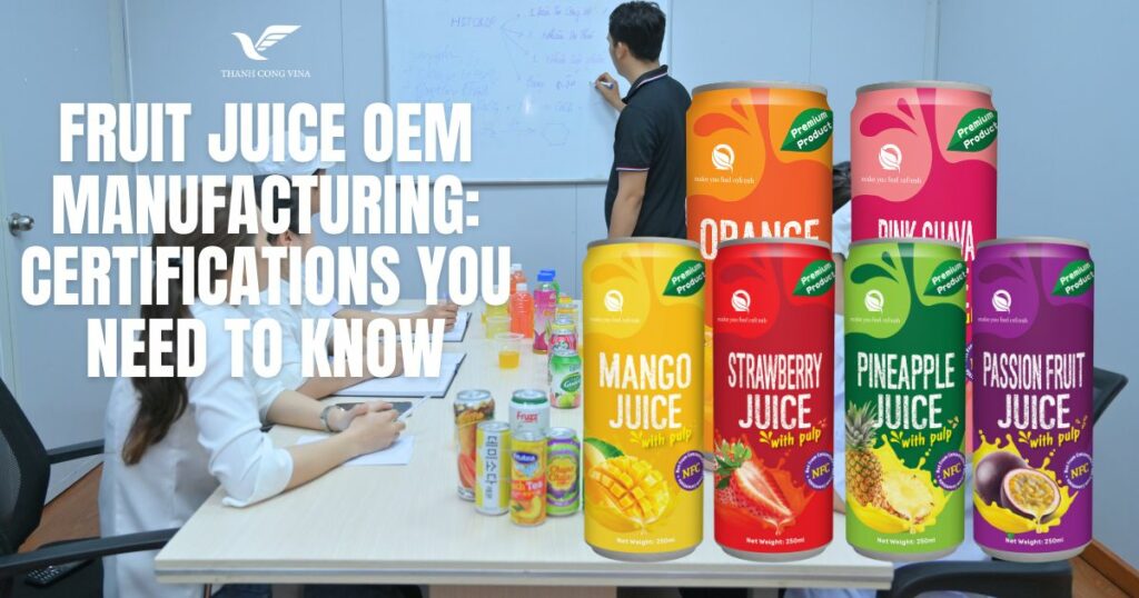 Certifications are the backbone of trust in fruit juice OEM manufacturing. They validate safety, quality, and compliance across every stage of production, enabling brands to compete confidently in global markets. Choosing a certified OEM partner reduces risk, enhances brand credibility, and supports sustainable growth. For beverage brands seeking a reliable and certified partner, Thanh Cong Vina offers comprehensive Fruit Juice OEM solutions built on international standards. With advanced facilities, strict quality control systems, and a commitment to regulatory compliance, Thanh Cong Vina supports brands from concept development to large-scale export. By partnering with Thanh Cong Vina, brands gain not only manufacturing expertise but also the assurance that their fruit juice products meet the highest global certification requirements.